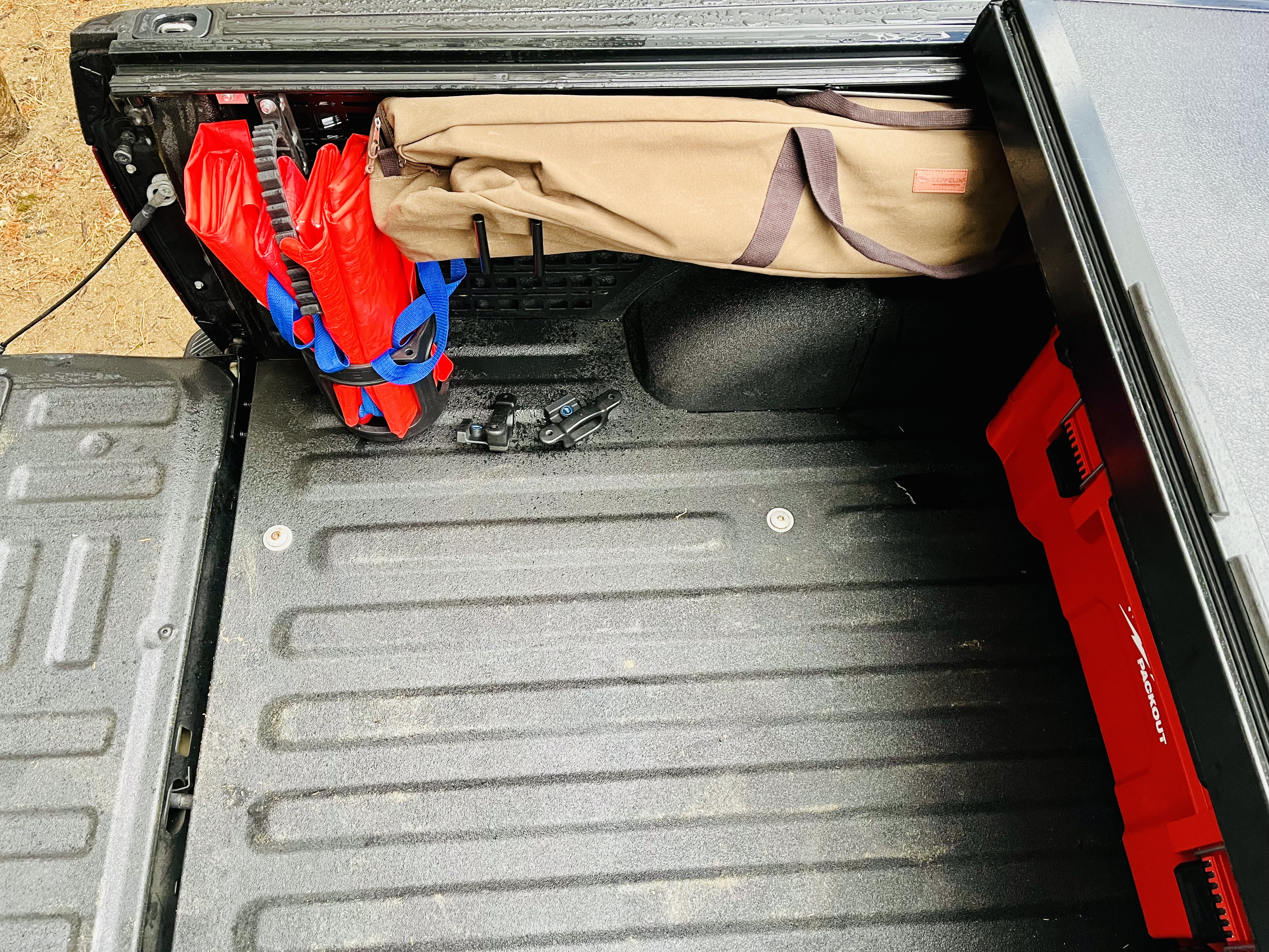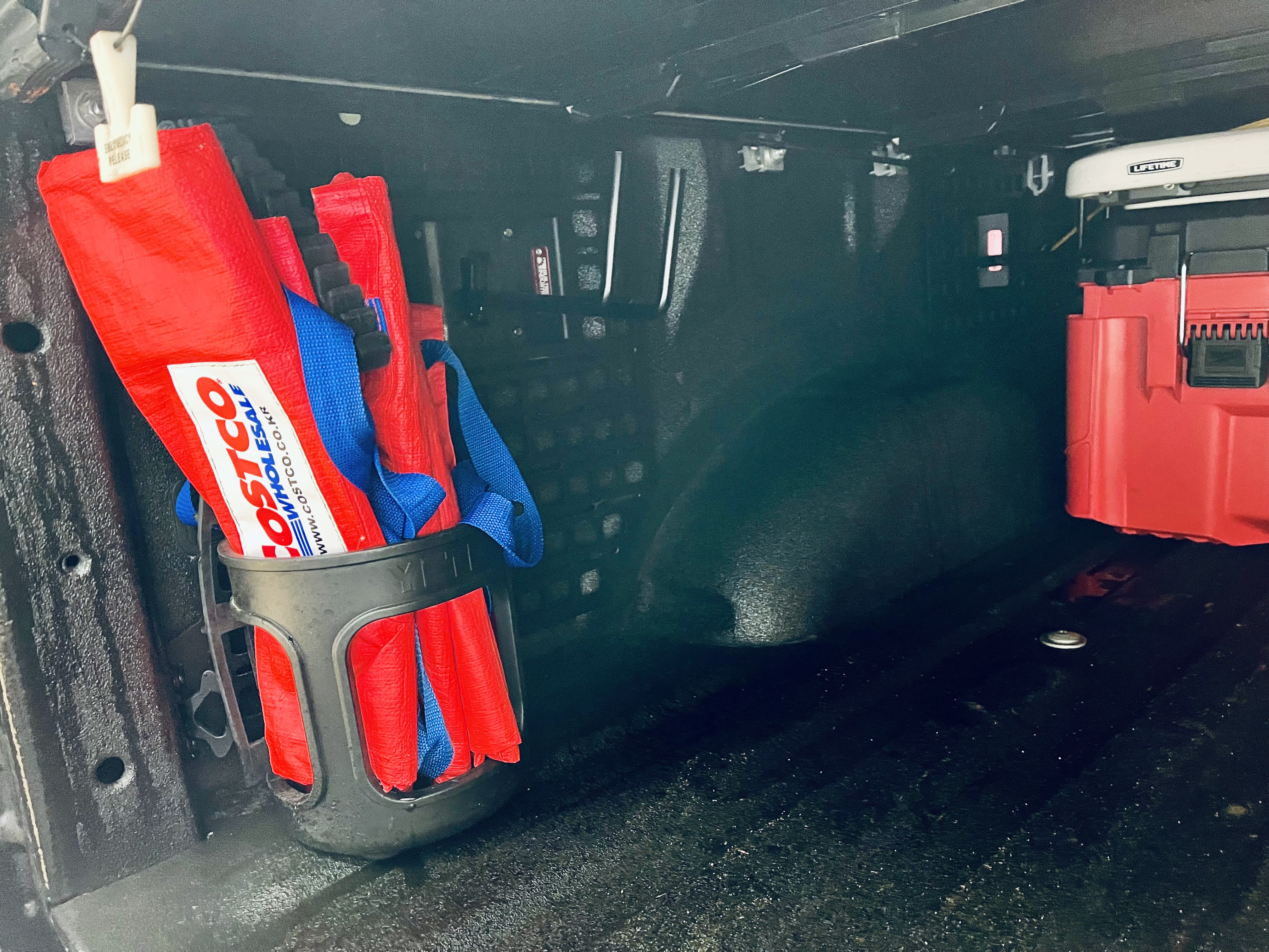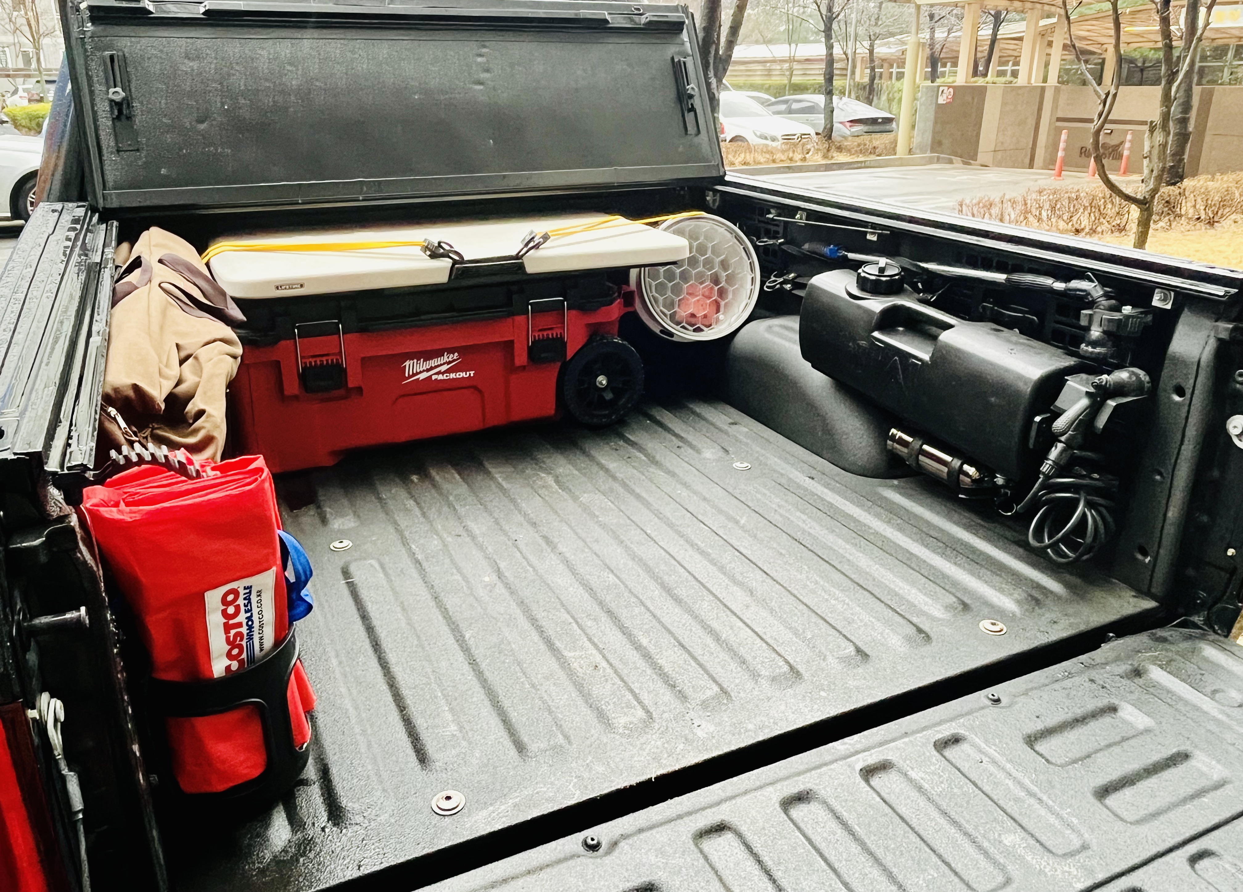 내부에 과거 구입한 밀워키 팩아웃 롤링 툴체스트와 라이프타임 폴딩 테이블이 내측에 있고, 예티 버킷은 오른쪽으로 자리를 옮긴 상황이 보이네요. COOLOCK J Hook은 과거 BoxLink에 장착했었던 Tie Down Anchor를 제거한 위치에 장착할 생각입니다.