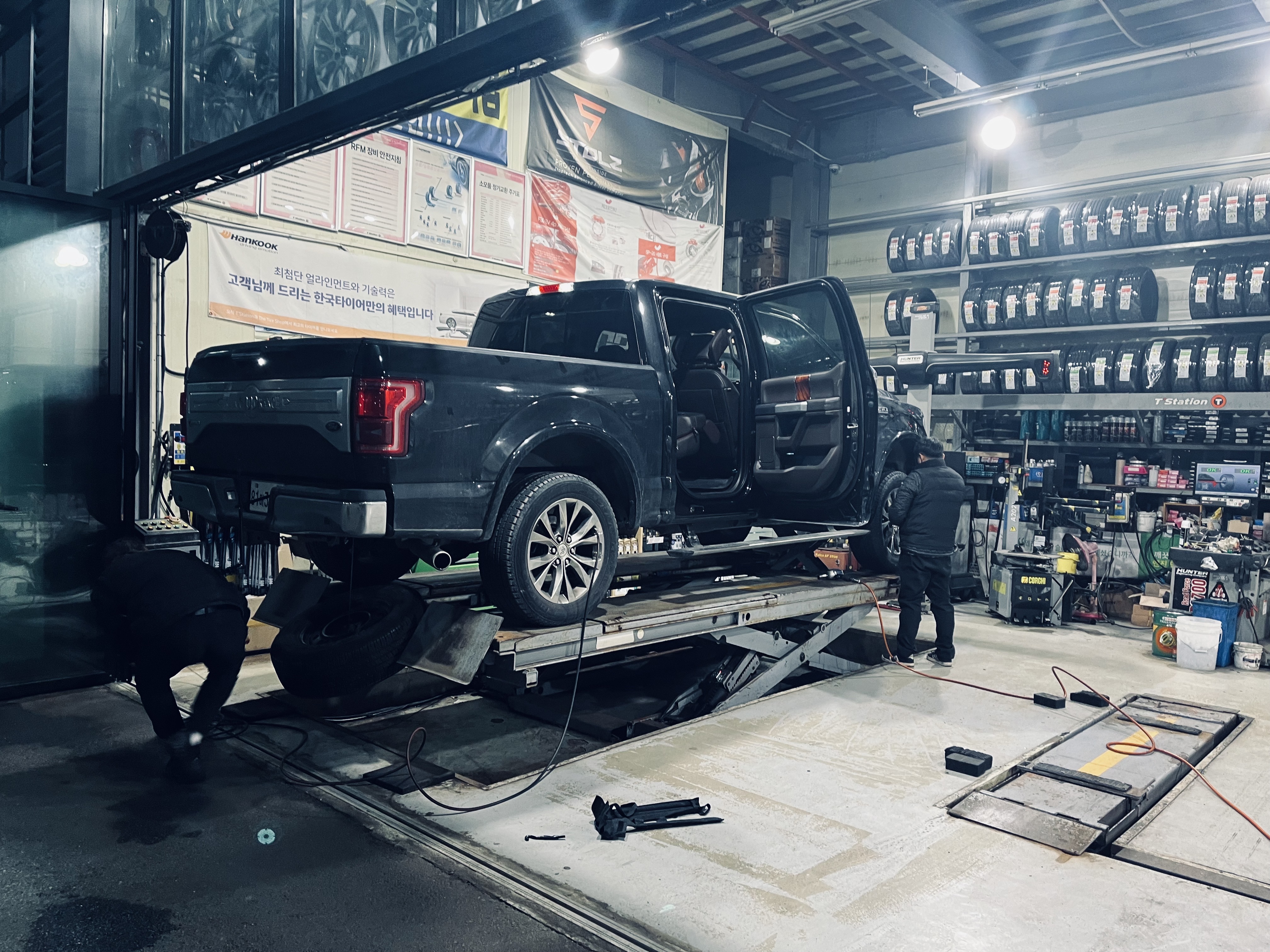 원래는 고객 대기실에 있어야 하는데, 스패어타이어를 원위치 시키기위해서는 차량 구조 장비와 열쇠키가 필요해 잠시 참가하게 되었습니다. 타이어를 교체하는 작업은 2-3분이 노련한 손길로 착착 작업이 이루어져서 혼자 스패어타이어를 꺼내끼우던 상황과 비할바가 아니었습니다. 스패어 타이어를 다시 원위치에 넣어주시고, 기존의 타이어를 다시 적재함에 옮겨주셔서 감사한 마음입니다.