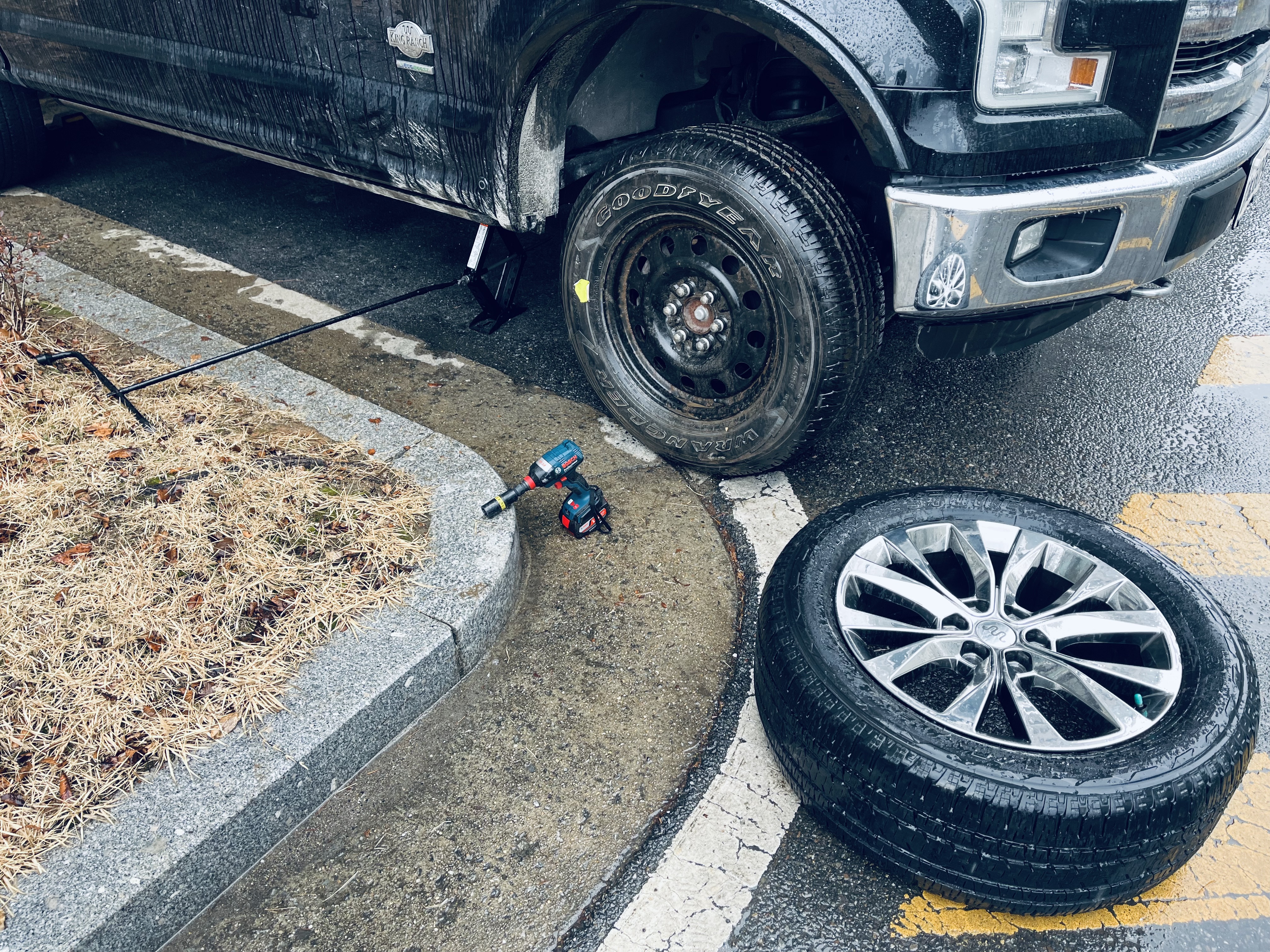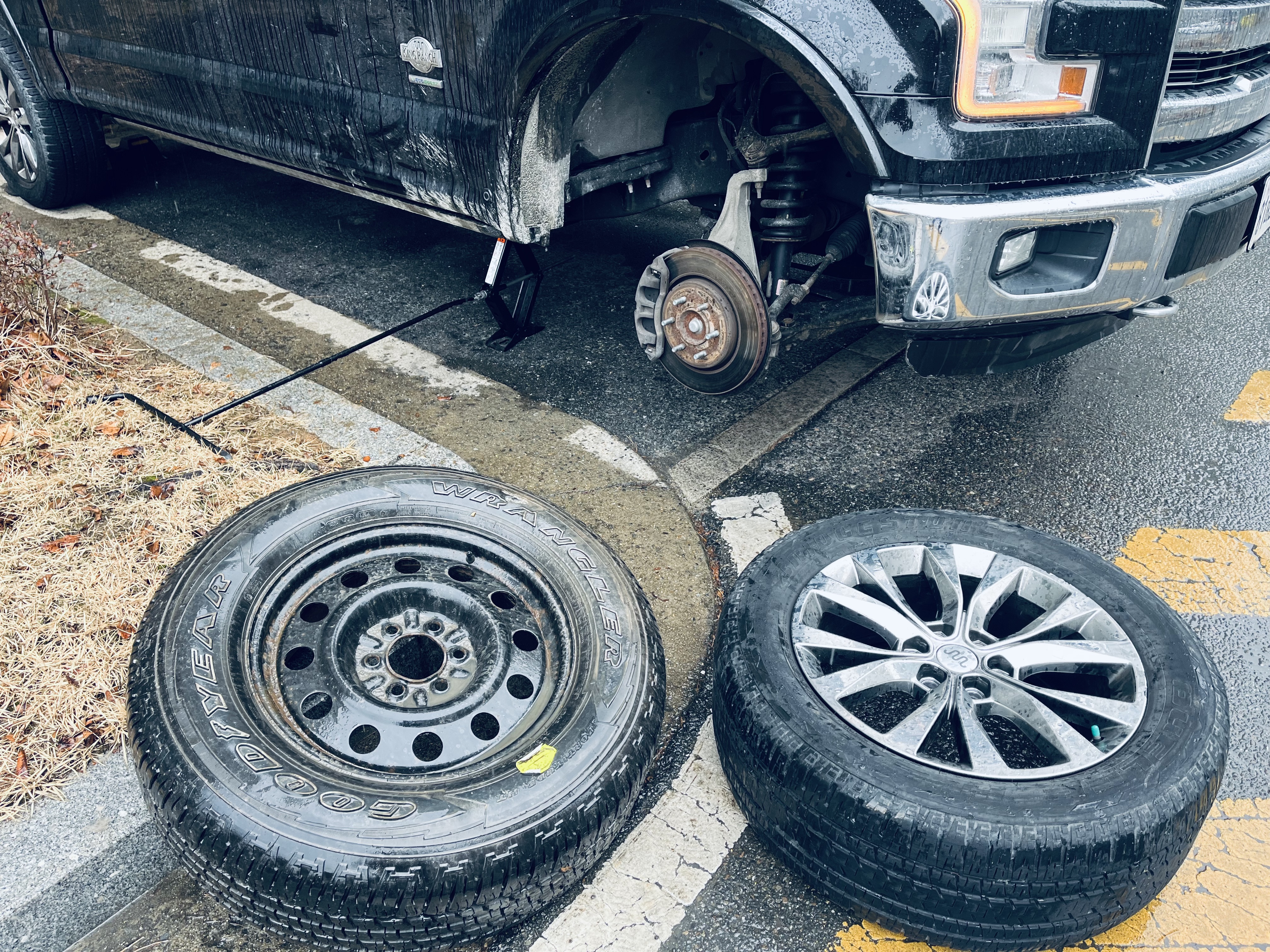 2시간에 걸쳐 매우 어렵게 교체하였습니다. 기존의 타이어는 적재함에 싣고 타이어전문점에서 바람을 주입했습니다.