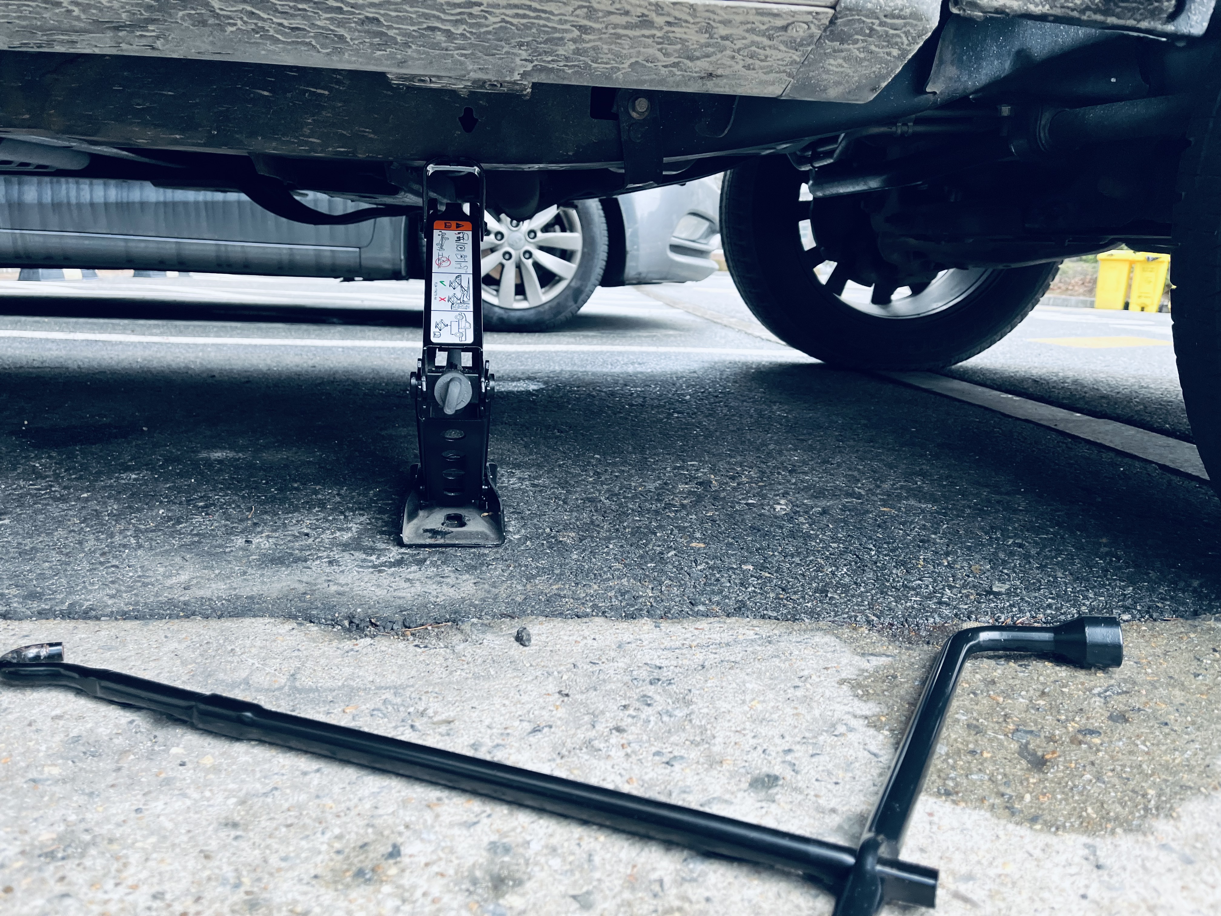 위 안내 매뉴얼에 따라 스패어타이어로 교체하였습니다.