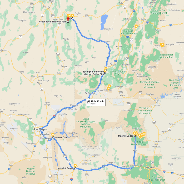 그랜드 캐년의 Maswik Lodge를 출발해 떠난 곳은 뜻밖에도 다음 여행지인 Great Basin National Park가 아니라, 인근 햄버거 집이었습니다. 그 버거 하나 먹겠다고 이렇게 돌아간건 정말.. 합리적이지 않습니다. 이 곳에서 햄버거를 먹고. 라스베가스를 스쳐지나, Cedar City에서 1박을 해 도착한 Great Basin 여정.