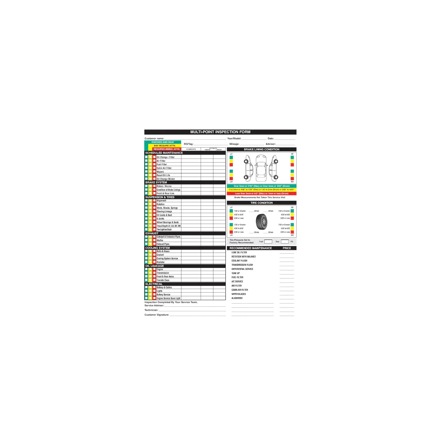 ‡Ford Multi-Point Inspection : 포드의 다중 지점 검사 체크리스트는 배터리, 엔진 오일 및 냉각수, 브레이크, 배기시스템, 타이어, 앞유리 와이퍼, 밸트 및 호스, 브레이크액, 실내 공기필터, 엔진 에어필터, 외부 조면, 파워 스티어링 오일, 정지, 변속기 오일 등을 검사하는 루틴 체크입니다.