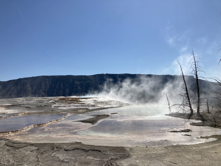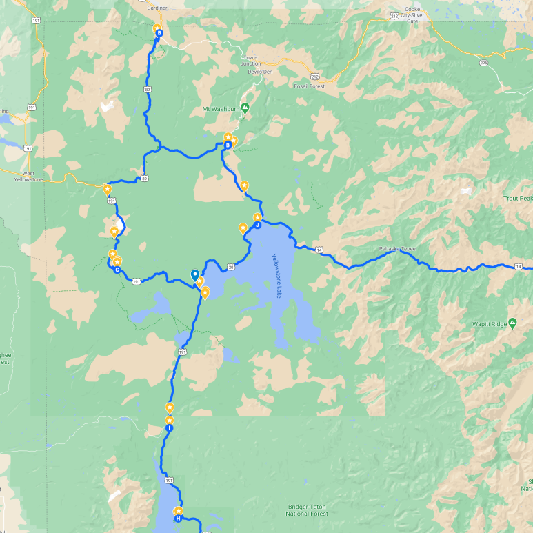 솔트레이크 시티를 떠나 그랑티턴 국립공원을 거쳐 올라오는 여정이었기 때문에 첫날은 옐로스톤 입구 직전에 있는 Headwaters Lodge & Cabins at Flagg Ranch에서 숙박을 한 후, 위 지도 (A)의 West Thumb Gyser Basin과 옐로스톤 호수 인근 지역을 둘러 보았습니다. 그리고 호수 인근의 랏지, Lake Lodge에서 지냈습니다. 이후 (B)의 Grand Cayon of the Yellow Stone을 둘러보고, Canyon Village의 Canyon Lodge and Cabins로 옮겼습니다. 다음 여정으로 (C) Mammoth Hot Springs 지역을 둘러본 뒤, 내려오면서 Norris Gyser Basin (D) 등을 비롯한 여러 Gyser를 둘러보며 마지막 Old Faithful Snow Lodge에서 몇 일을 투숙하였습니다. 더 많은 여행지를 골라 이동할 수도 있었겠지만,옐로스톤에서 체력을 안배하며 느긋하게 가장 긴 시간을 보낼 수 있도록 계획하였습니다. 옐로스톤 랏지 예약은 하늘의 별따기로 어려우니 최소 6개월 전 예약하시는 것이 좋습니다.