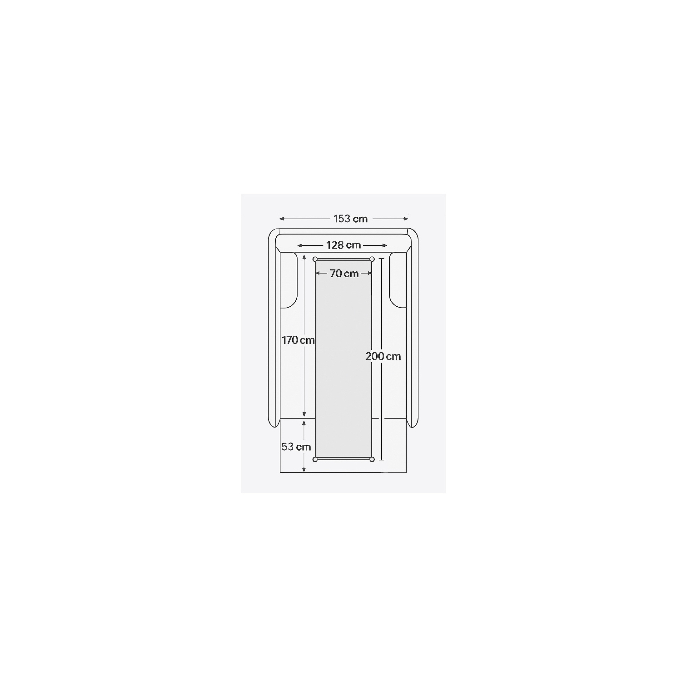TCOT 야전침대를 F150의 트럭베드에 설치하여 야영이 가능한지를 검토해보고자 합니다. 우선, Ford F150의 트럭베드 실측치를 바탕으로 평면도를 그렸습니다. 다양한 정보를 취합한 결과, 트럭베드의 좌우 폭은 가장 넓은 곳이 약 153cm, 휠하우스를 기준으로 한 실사용 폭은 약 128cm입니다. 전후 길이는 약 170cm이며, tailgate를 닫은 상태에서 측정된 수치입니다.