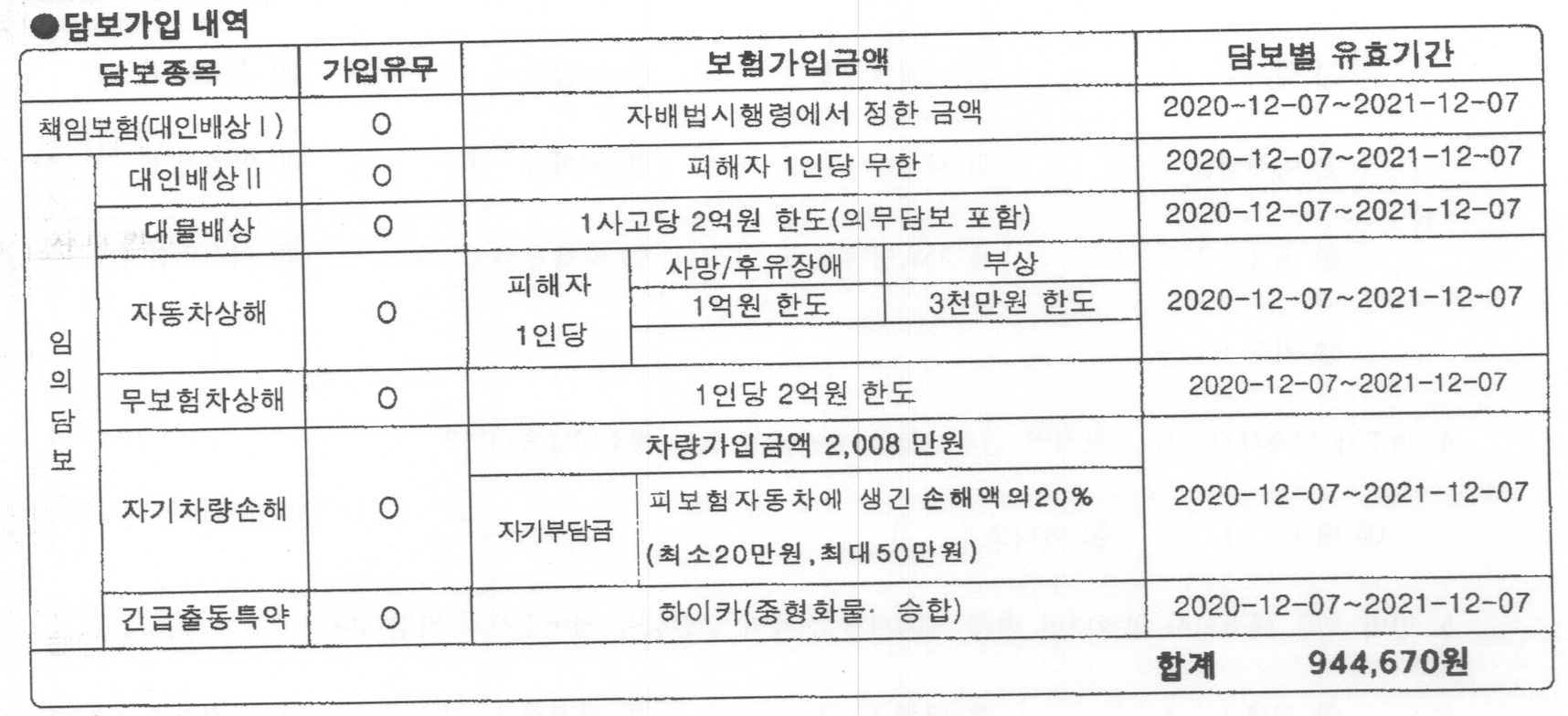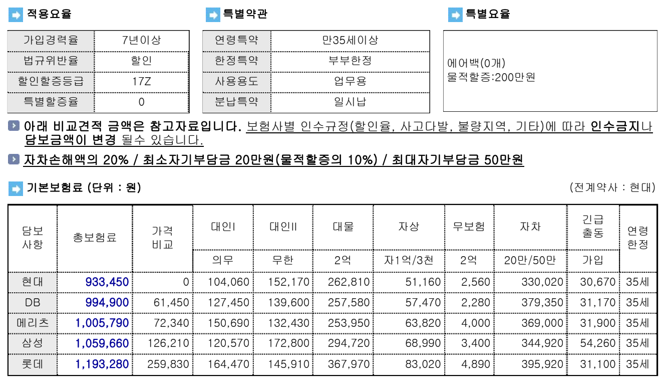 결국 위와같이 자동차 보험이 마련되었습니다.