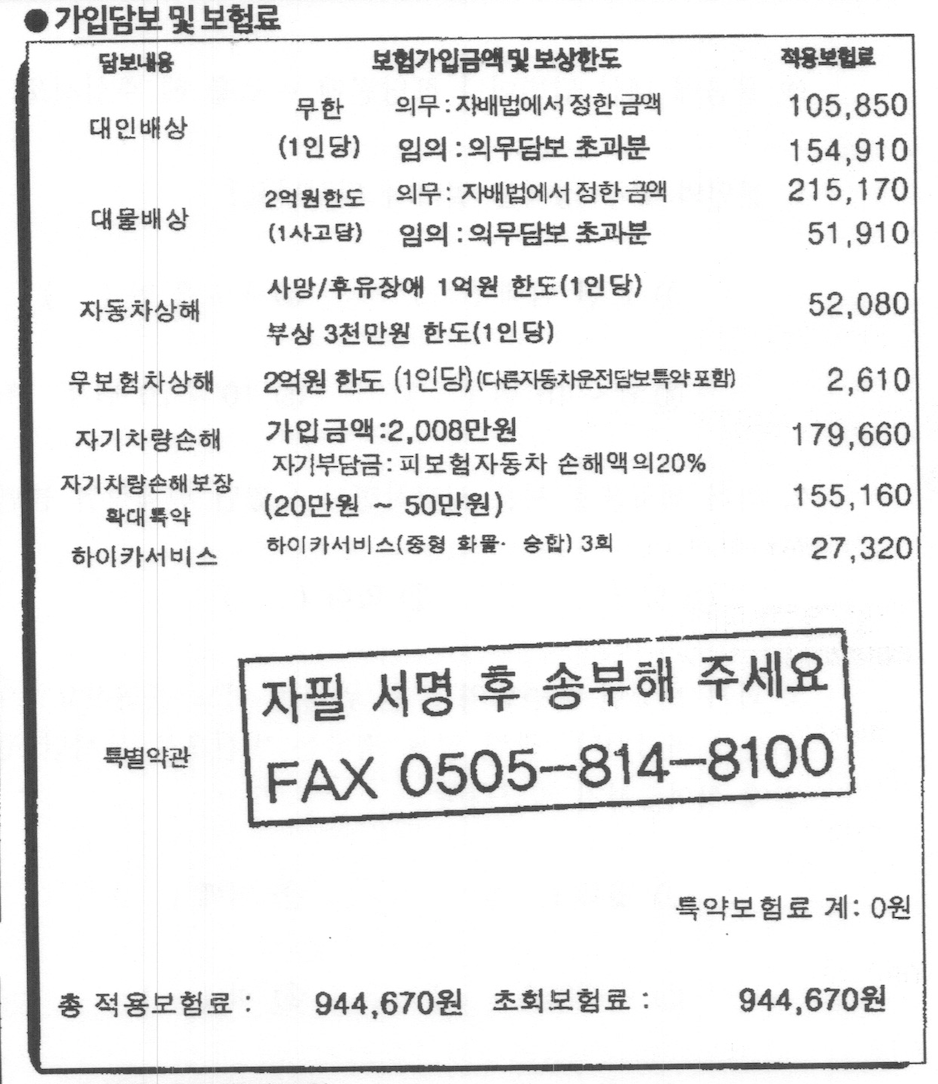 아래는 자동차 보험 설계사가 살펴준 제 차의 보험 견적서입니다.