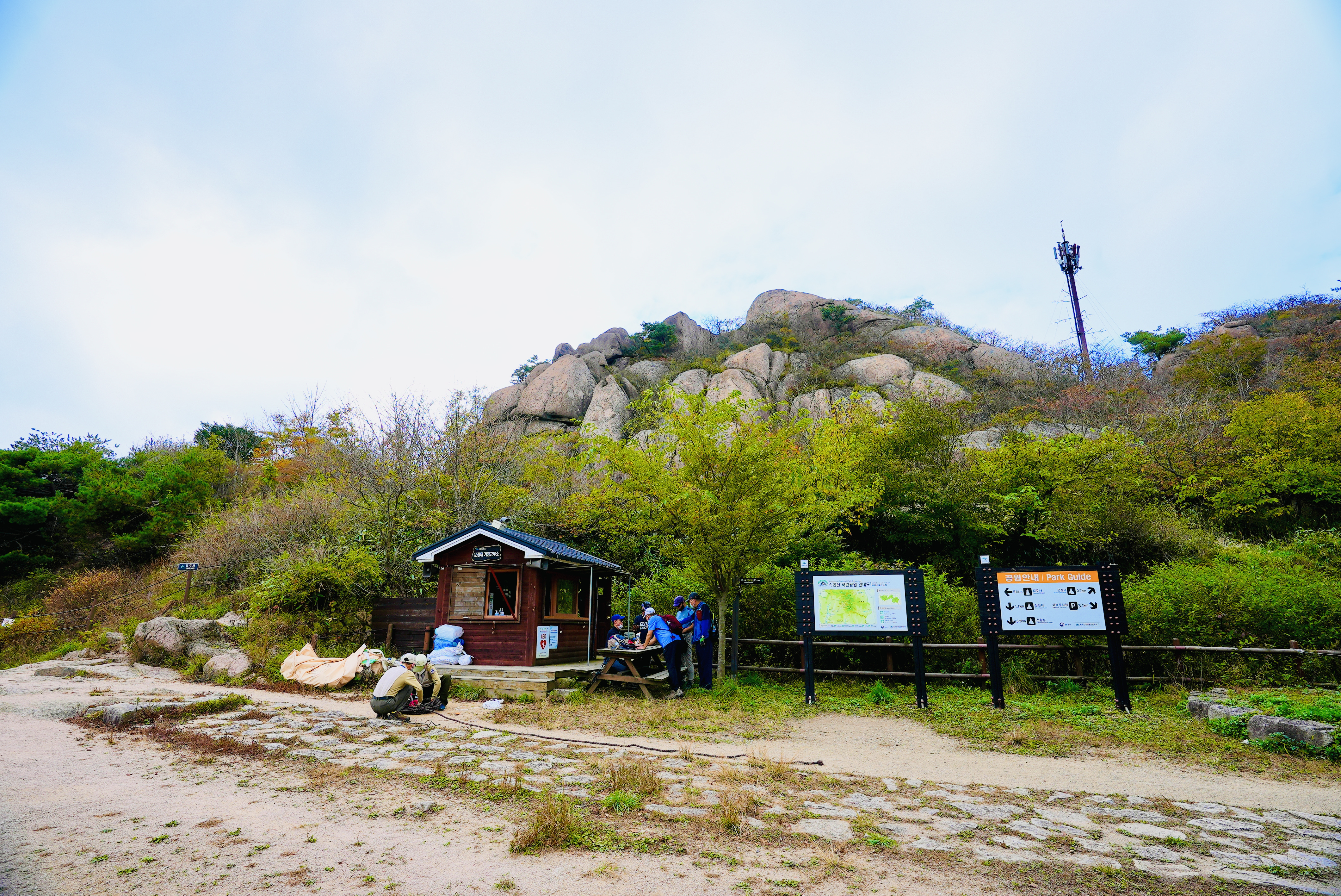 최근에 모든 가족의 등산 스틱을 구했고, 모두의 산악 등반 가능성에 대해 고민을 해왔기 때문에 충분한 준비를 했다고 생각했습니다. 식사는 등산 직전에 출발지에서 먹기로 하고, 계란, 삶은 고구마, 사과, 오이, 피자, 컵라면, 믹스커피, 믹스코코아, 생수 5병 정도를 준비해 떠났습니다. 그리하여 도착한 곳은 상주시 화북면 속리산 화북오송탐방지원센터입니다.