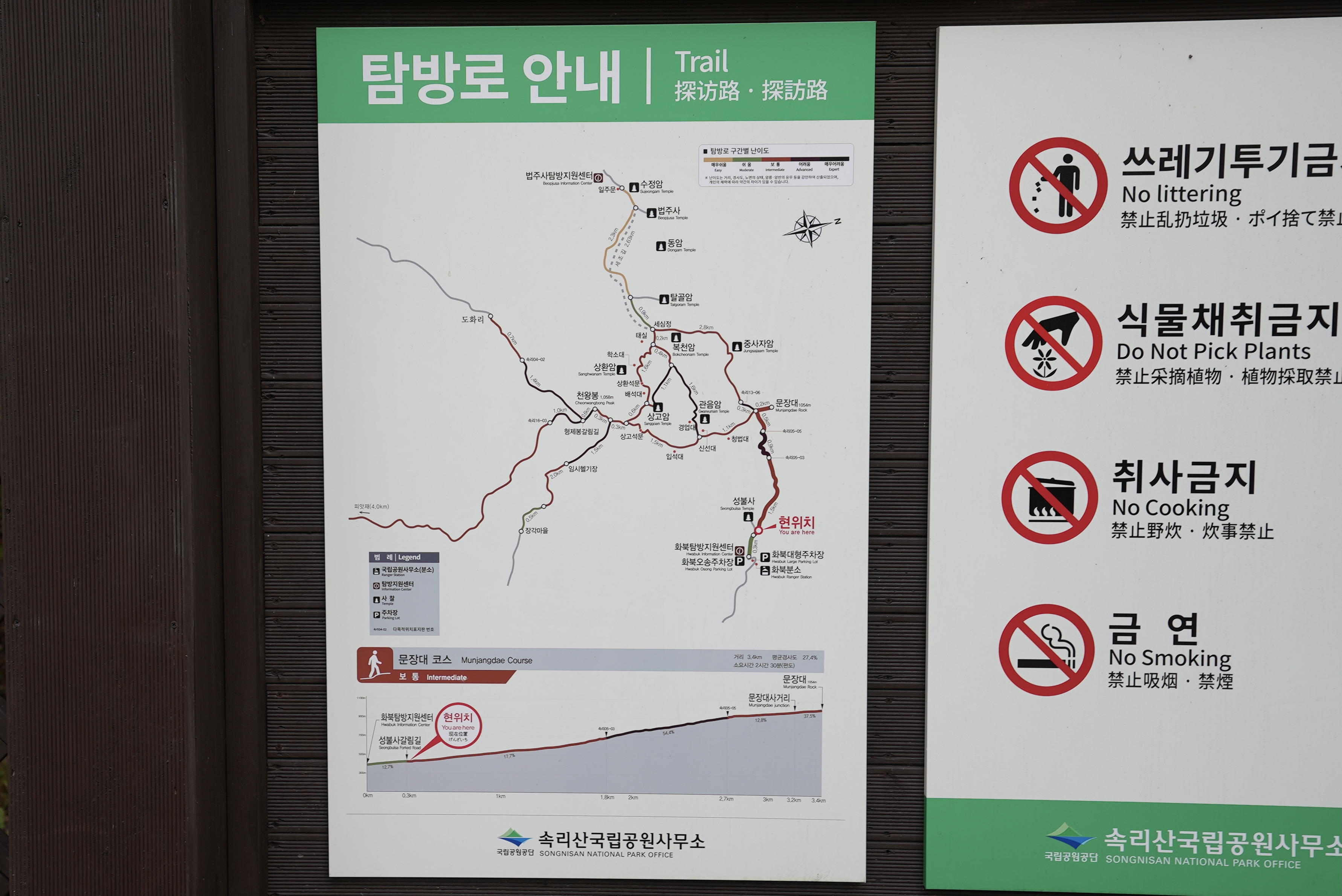 이곳 성불사 갈림길에서 오르는 구간에 대한 안내지도가 있는데, 문장대 까지는 3km로 사람이 시속 4km인 것을 생각해보면 간단히 쉬고 오면 되겠네 싶을 수 있습니다. 하지만, 탐방로 1.8km 지점부터 2.7km 구간에 경사도가 무려 54.4%에 이릅니다. 짧지만 높은 곳입니다.
