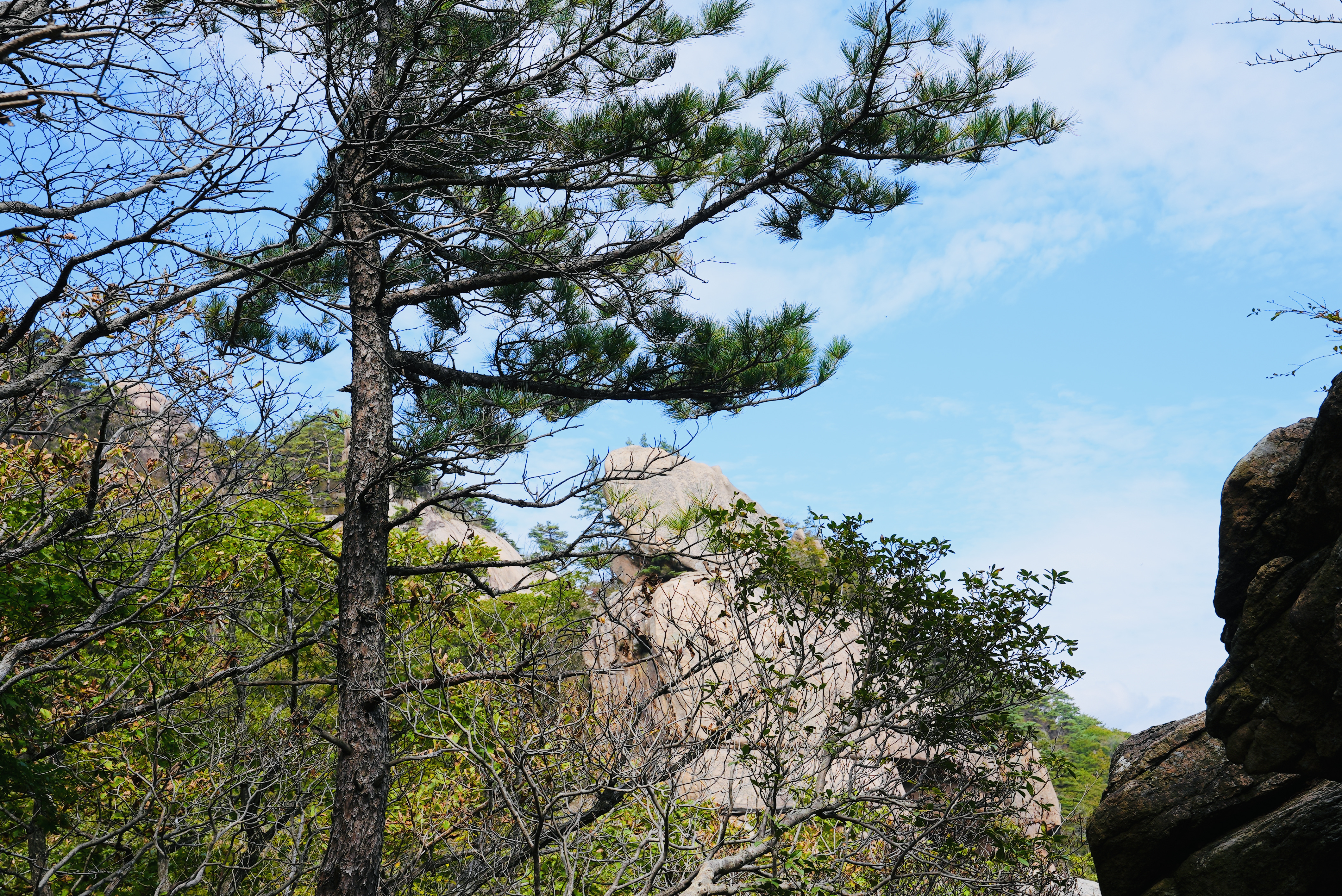 숲을 지나며 언제 정상이 보이나 싶을 그 즘에 잠깐 보이던 돌봉우리.