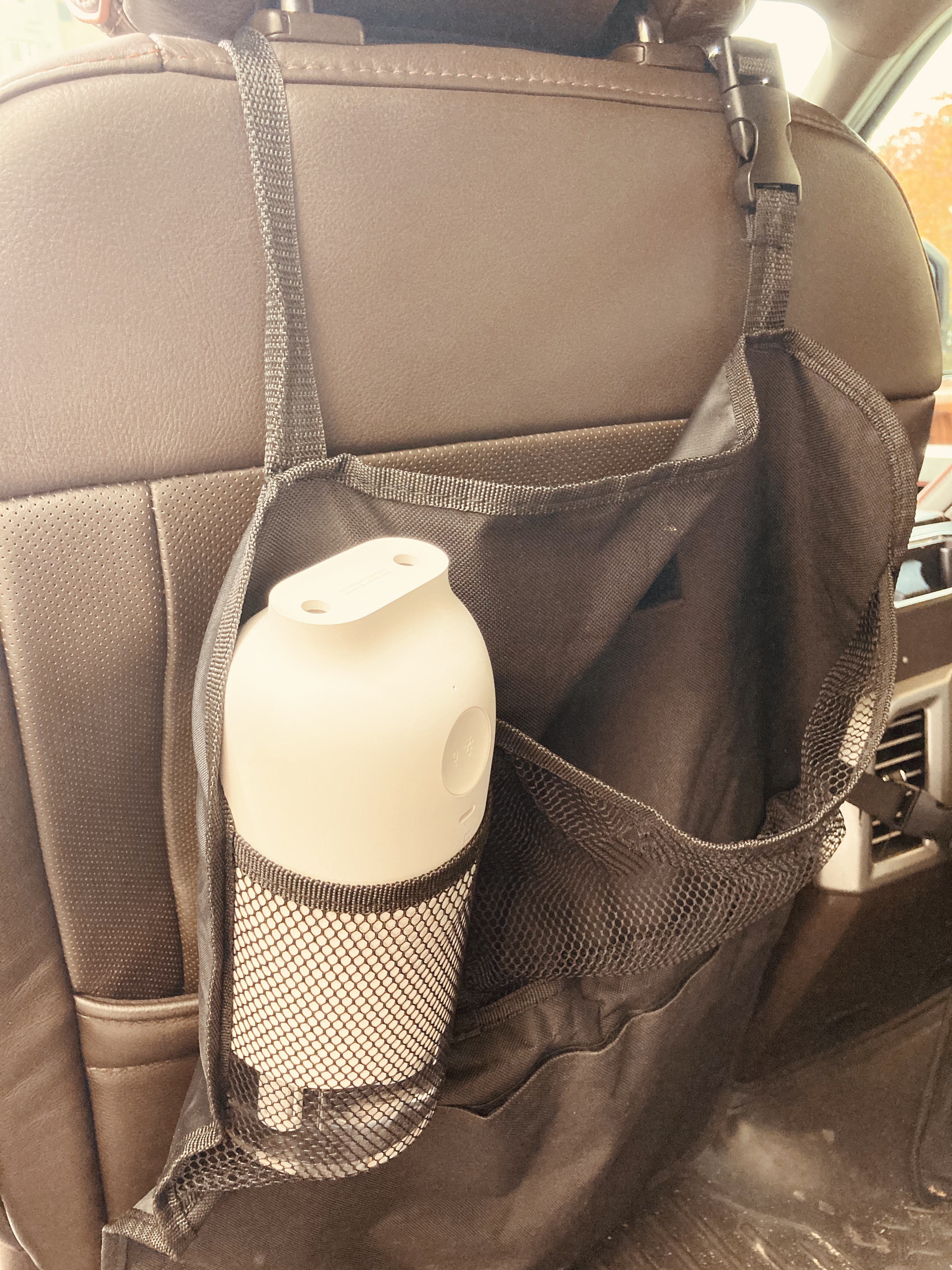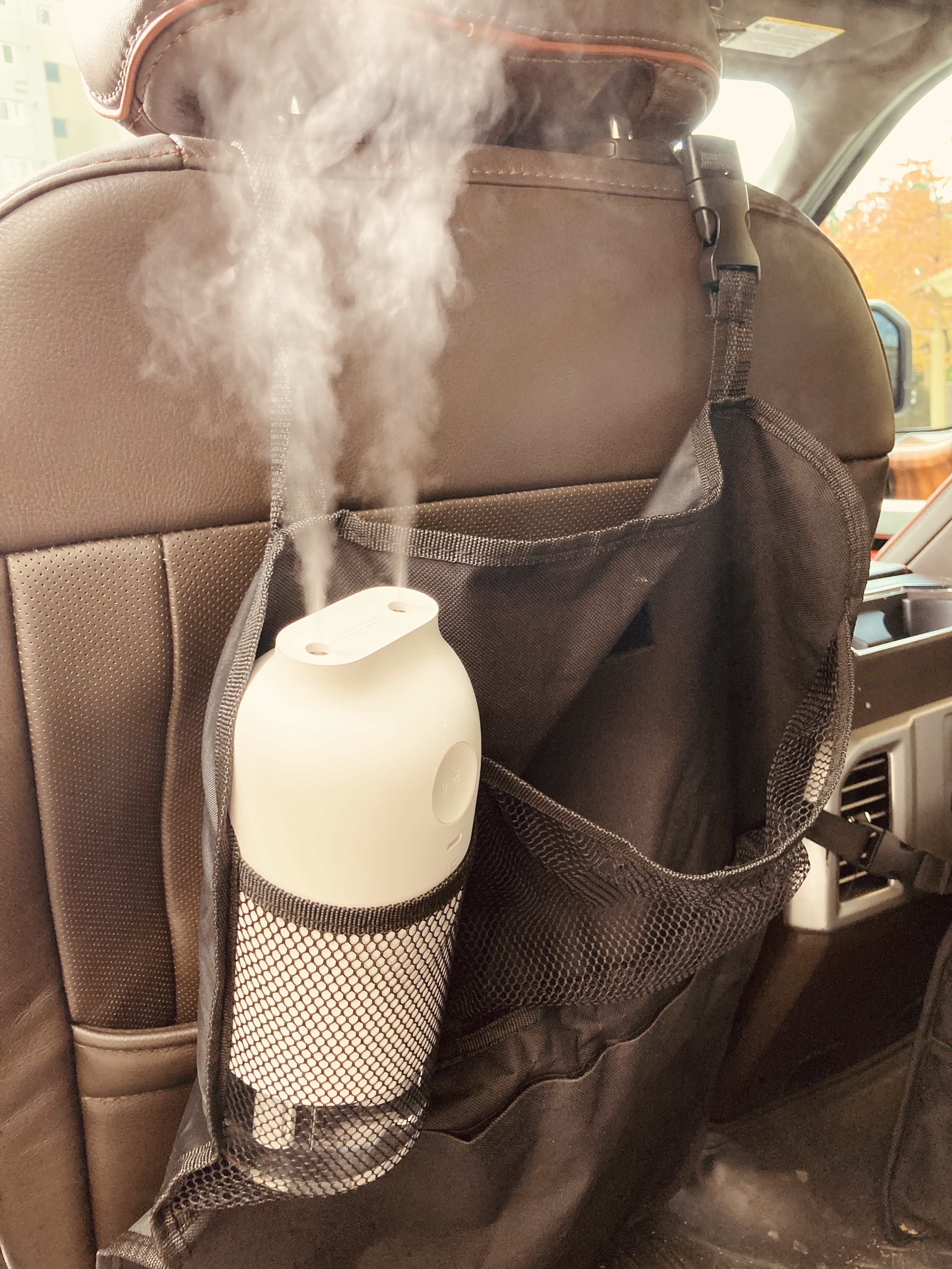 아쉬운 대로 차량 실내에 Backseat Cover를 달고 물병을 넣는 자리에 가습기를 넣어보니 안성맞춤이라 이렇게 사용하였습니다. 좀 불편하고 거추장스러움이 있습니다.