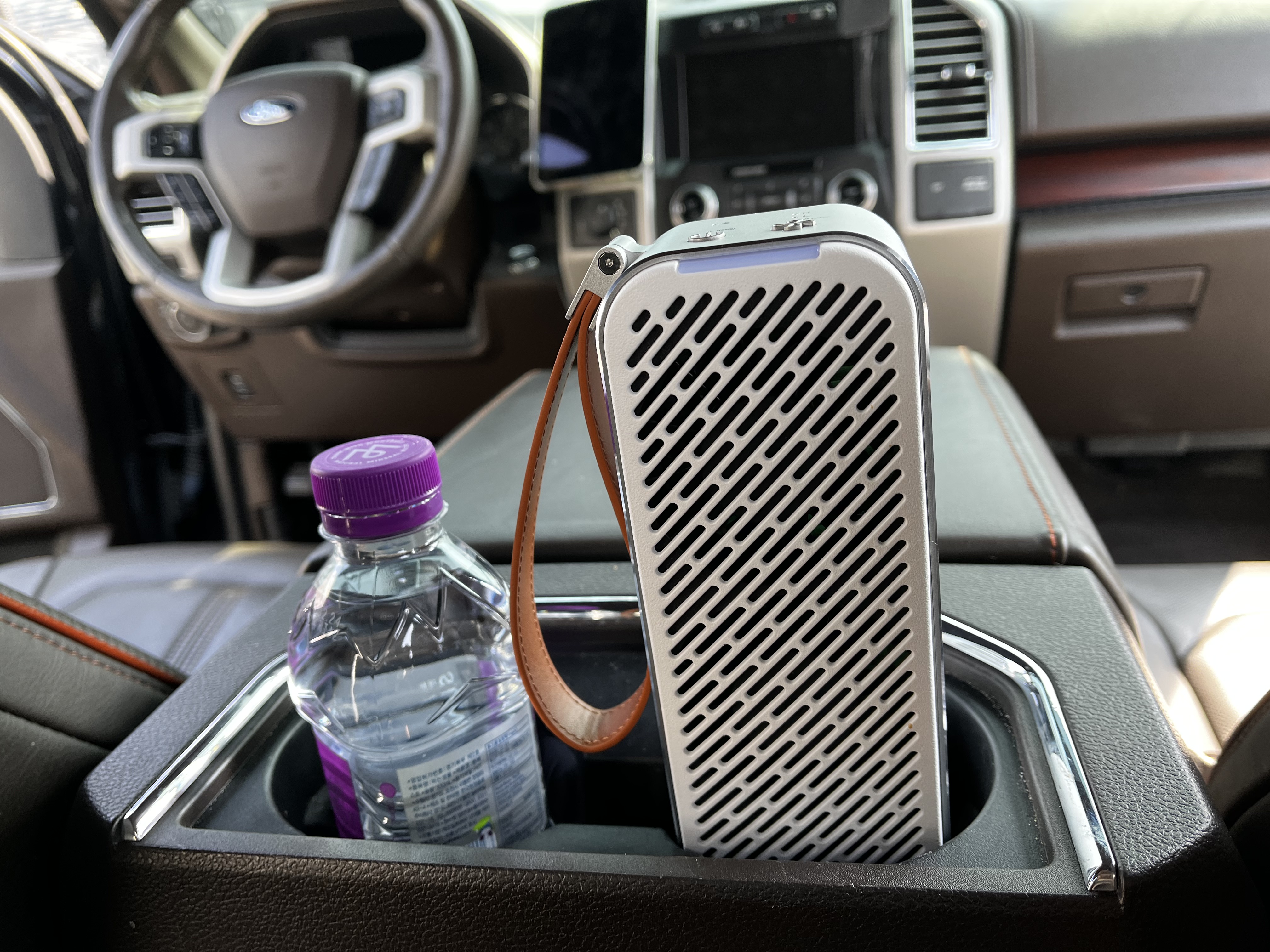 이 제품은 F150의 컵홀더에 딱맞게 들어가는 사이즈를 갖고 있습니다. 크기(WxHxD) 69x200x64mm, 무게 530g입니다. 특히 아래 사진처럼 센터 콘솔에 넣어두면 차량 정중앙에서 미세먼지 제거를 진행하게 됩니다.